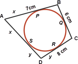 A circle is inscribed in a quadrilateral as shown. If AB = 7 cm, BC = 6 cm and CD = 8 cm, then the length of AD is?